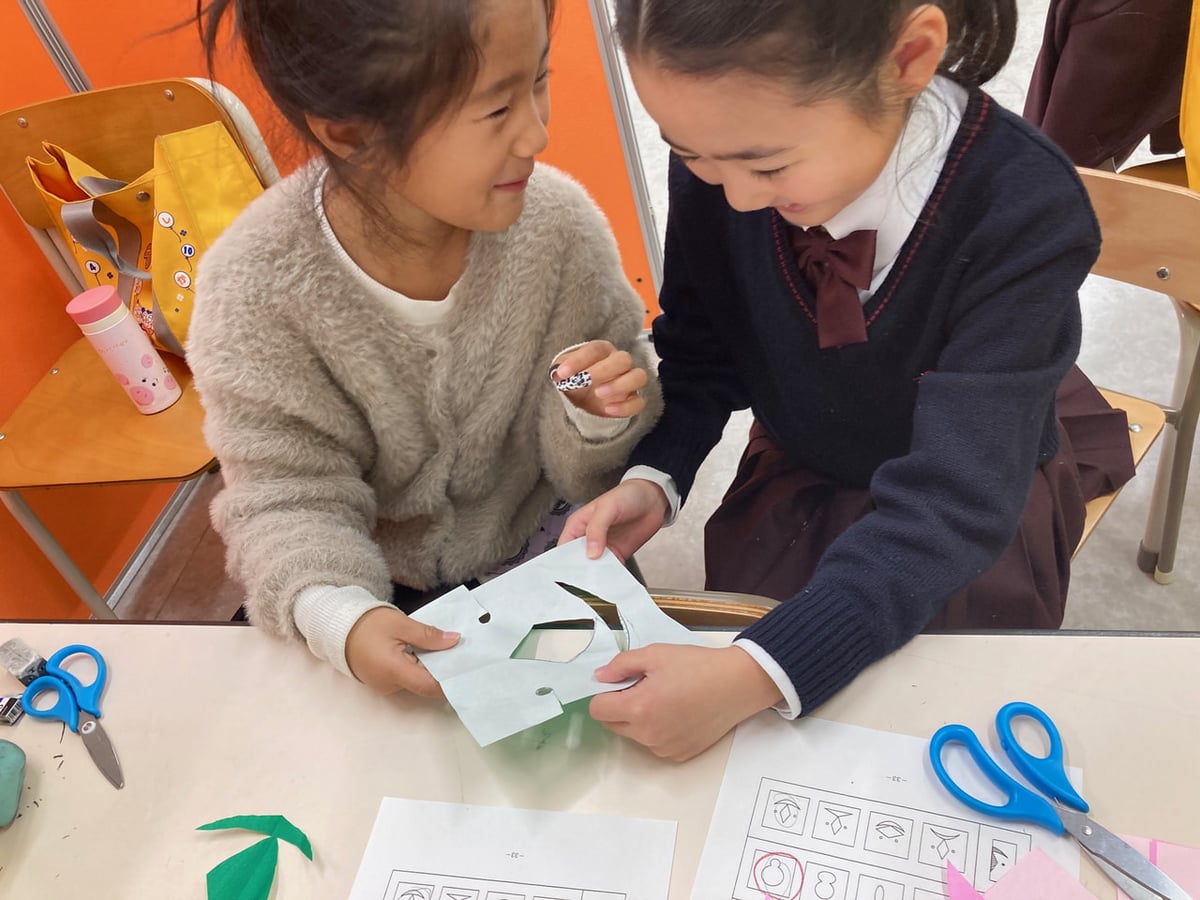 「左がこうなってるでしょ?開いたら右がこうなるから、これ!」と、考えた過程を教えてくれます。