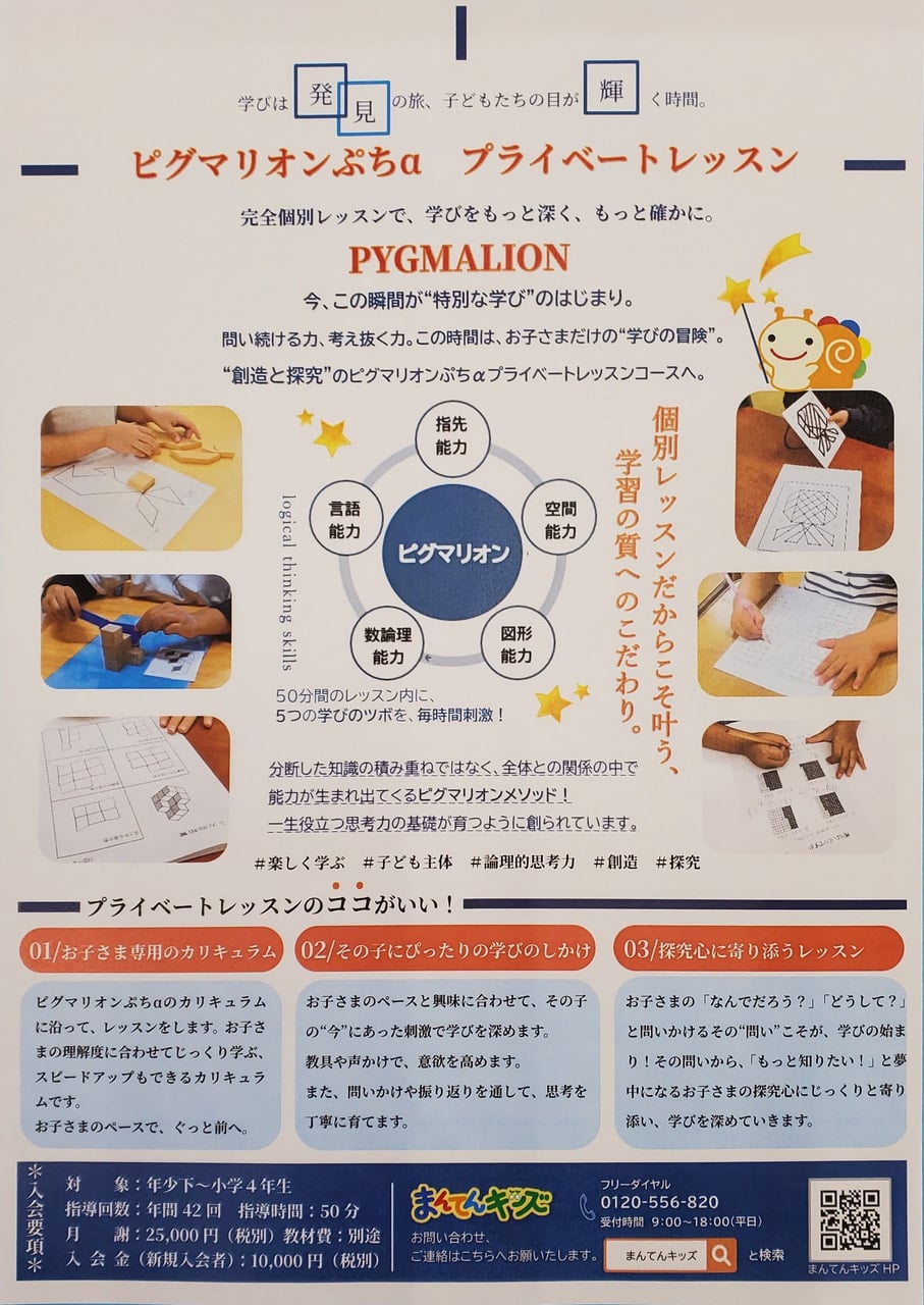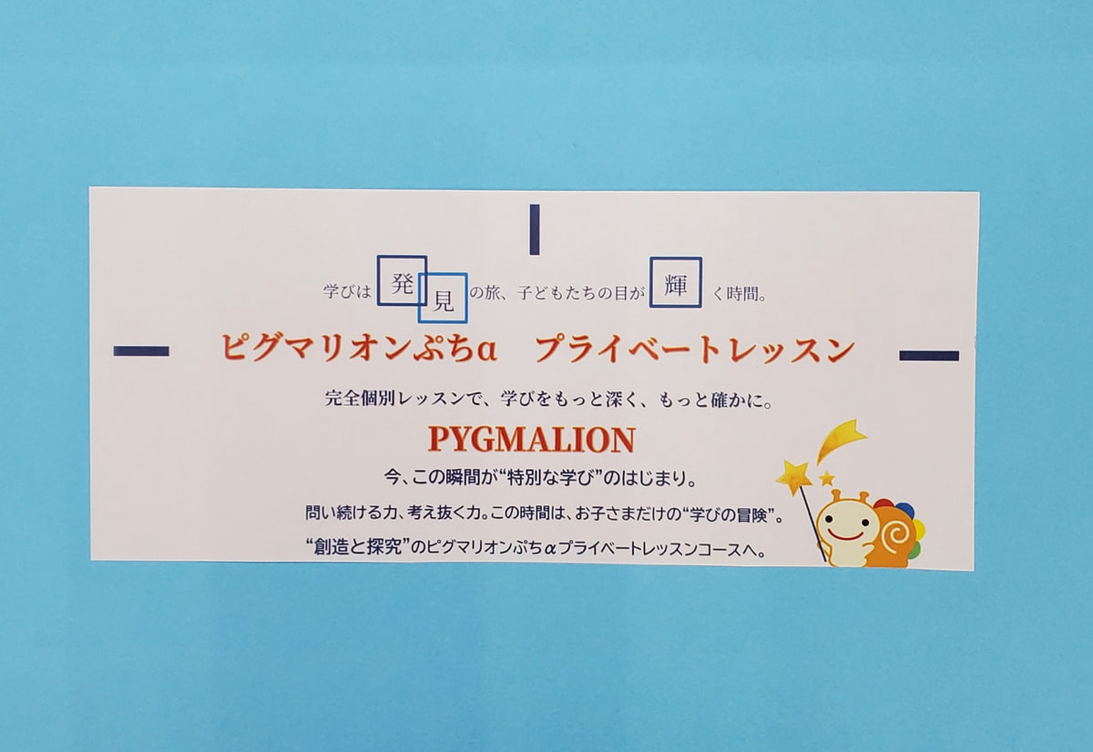 ✨✨✨新コース!「ピグマリオンぷちαプライベートレッスン」始まりました!✨✨✨完全個別レッスンで、学びをもっと深く、もっと確かに。ピグマリオンぷちαのカリキュラムに沿って、レッスンをします。お子さまの理解度に合わせてじっくり学ぶ、スピードアップもできるカリキュラムです。 お子さまのペースで、ぐっと前へ!*ぜひ、無料体験にいらしてください。お待ちしております。体験申込、お問い合わせは、「✉体験申込・お問い合わせ」からどうぞ。
